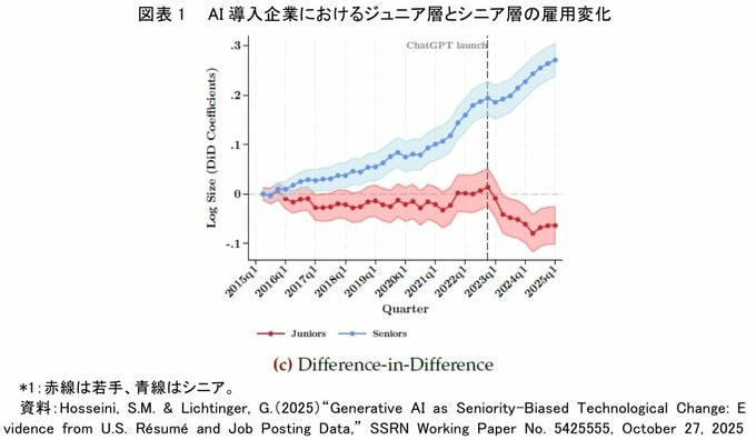 結果によると、AIを導入した企業では、若手(ジュニア)雇用が急減した一方で、ベテラン(シニア)雇用はほぼ横ばいで推移した。