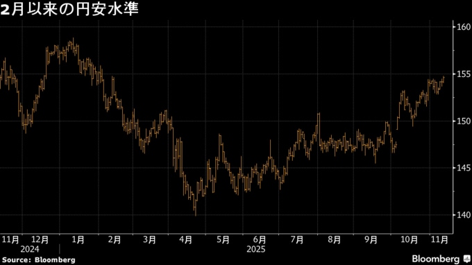 12日の円相場は対ドルで154円台後半と、2月以来の円安水準に下落。米国の政府機関再開への期待や株高がドルを支えている。円安の進行について片山さつき財務相は国会で、「足元は一方的な急激な動きが見られる」と指摘。「マイナス面が目立ってきていることは否定できない」と市場をけん制した。