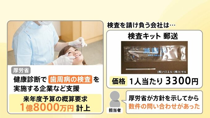 企業がどのような検査をしてくれるのか。一例では、検査キットが送られてきて、付属している小さいブラシで歯と歯茎の間をなぞるように拭い、これを送り返すだけで、歯周病かどうかが分かるとのこと。価格は1人当たり約3300円ということです。