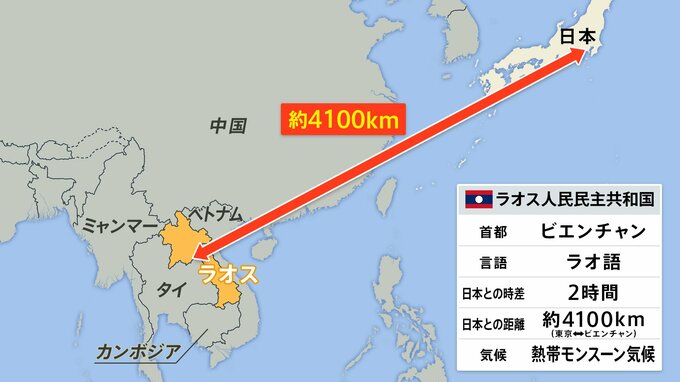日本から約4100km(東京⇔ビエンチャン)離れた東南アジアの国。面積は日本の本州と同程度で、ASEAN加盟国で唯一海に面していない。日本からの直行便はなく、タイやベトナムを経由して最短半日かけて入る。