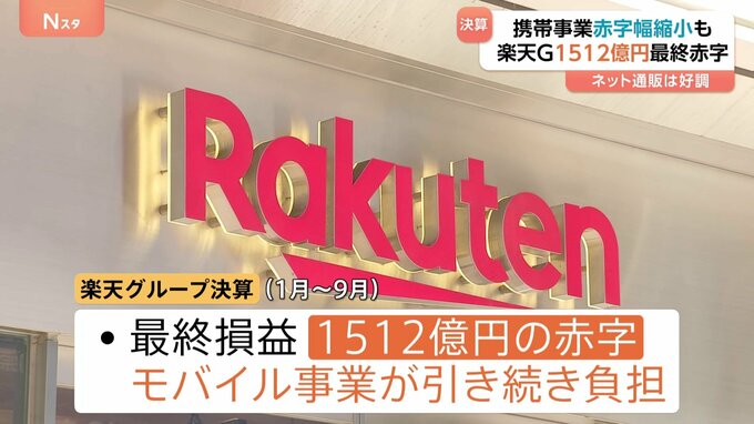 楽天グループの今年1月から9月までの決算を発表し、最終損益は1512億円の赤字となりました。この期としては8年連続の赤字です。楽天グループの今年1月から9月までの連結決算によりますと、売上高は前年より10.5%増…