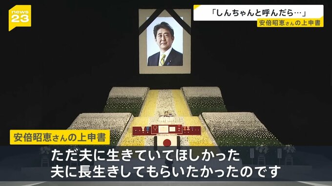 「事務所から電話があり『夫が撃たれた』と。思わず『えーっ』と大きな声を出してしまいました。病院に着いて、医師から説明を受けて『ああ、ダメなんだ』と、夫の死を悟りました。耳元で『しんちゃん、しんちゃん』と呼んだら、手をほんの少し握り返してくれたように感じました。体はまだ温かく、頑張って待ってくれていたんだなと。ただ夫に生きていてほしかった。夫に長生きしてもらいたかったのです。それが妻である私の心情です」