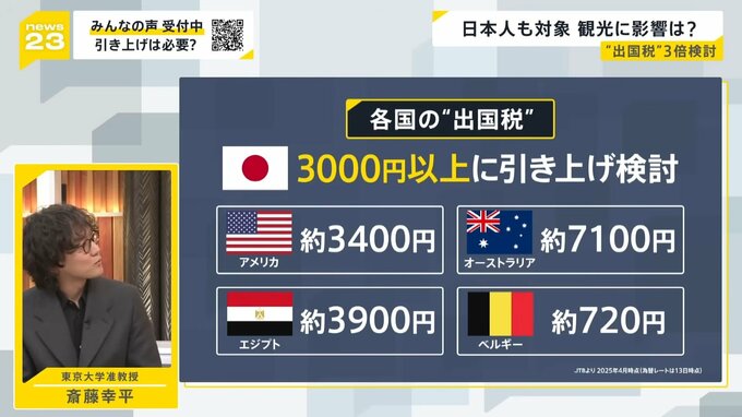 日本が3000円以上に引き上げを検討しているということですが、各国の出国税を見てみると、大体同じぐらいか、オーストラリアはもっと高いですよね。