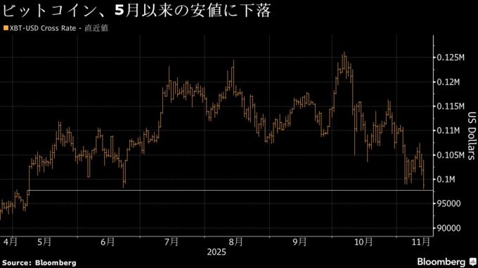(ブルームバーグ):暗号資産(仮想通貨)ビットコインが10万ドルの大台を割り込み、そこからさらに深く沈んだ。新たなリスク回避の動きとハイテク株売りで米金融市場に不安が広がっている。