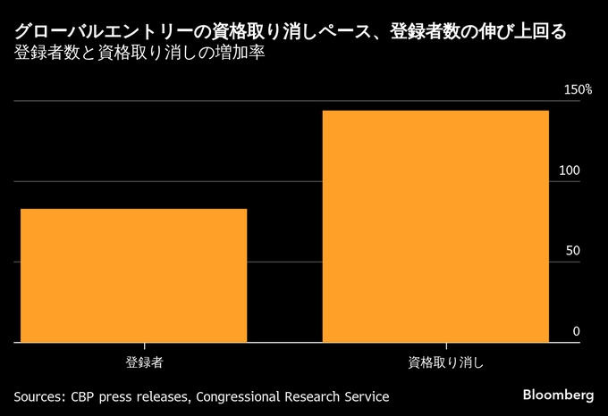 CBPは既存の登録者に対し定期的に審査を行い、資格要件を満たしているか確認している。これまでは登録取り消しはまれで、ブルームバーグがCBPのデータや発表資料を分析したところでは、過去には毎年約1000人に1人程度しか資格を失っていなかった。主な理由は刑事事件での訴追や保安検査場への銃持ち込み、またグローバルエントリーの場合は未申告の果物や野菜の持ち込みといった農産物に関する違反などだ(ただCBPのオンブズマン事務局は、一定の条件下で例外を認めることができる)。