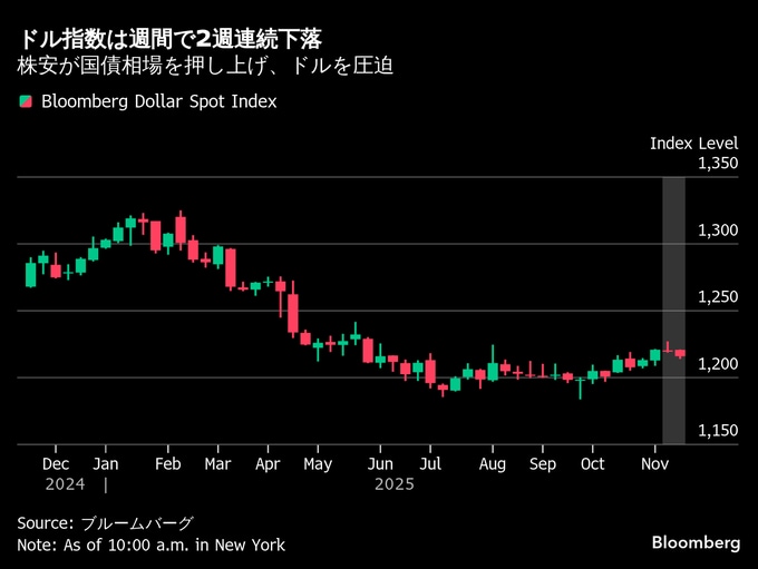 主要10通貨に対するドルの動きを示すブルームバーグ・ドル・スポット指数は、週間ベースでは8月以来となる2週連続安。