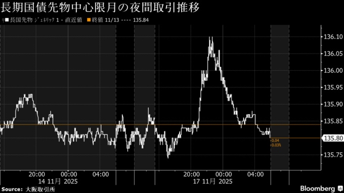 先物夜間取引で12月物は14日の日中取引終値比6銭安の135円80銭で終了した。14日の米10年国債利回りは前日比3ベーシスポイント(bp、1bp=0.01%)高い4.15%程度。