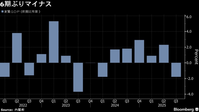 予想より小幅な悪化にとどまったものの、マイナス成長は「強い経済」を目指す高市早苗政権にとって積極財政を正当化する材料となり得る。個人消費は力強さを欠き、輸出は不透明感がくすぶるなど、内外需ともにけん引役が不在だ。経済対策の議論が進む中、市場は財源の裏付けとなる補正予算の規模を注視している。