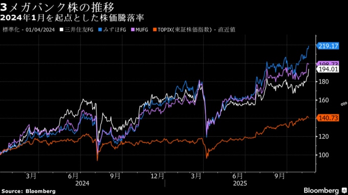 3メガ銀行グループは14日、金利上昇に伴う企業向け融資からの収益拡大や株高などを背景に、そろって今期純利益予想を上昇修正した。三菱UFJフィナンシャル・グループ(MUFG)と三井住友FGは3期連続、みずほFGは2期連続の最高益となる。
