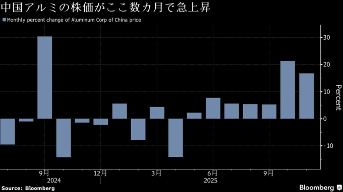 アルミニウム業界では、中国アルミが過去1カ月で約35%上昇し、CSI300構成銘柄の上昇率上位銘柄に入っている。山東南山や雲南も約30%上昇している。