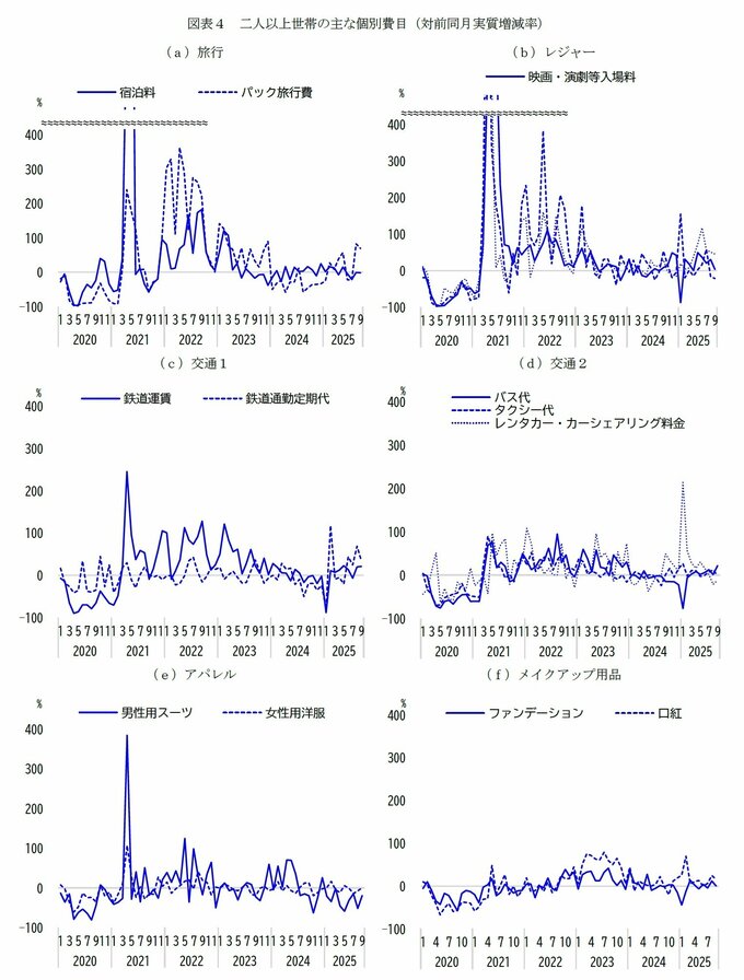 特に2025年8・9月の「パック旅行費」は前年同月比で大幅に増加しており(+70%前後)、国内・海外いずれも支出が増えているが、海外パック旅行の伸びがより顕著である。