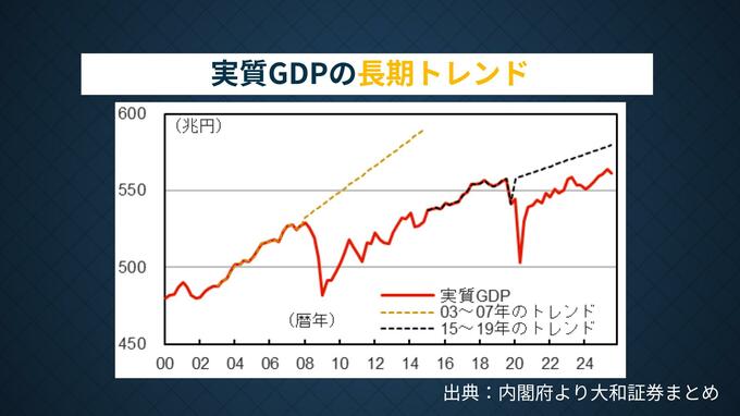 ここで末廣氏が重視するのは日本経済の長期トレンド。「赤い線が実際のGDPの推移で、黒い点線はコロナ前のトレンド。コロナ後の回復としてはやはりちょっと物足りない」と分析します。本来なら、コロナ前のトレンドラインまで回復したいところですが、そこまで到達できていないのが実情です。