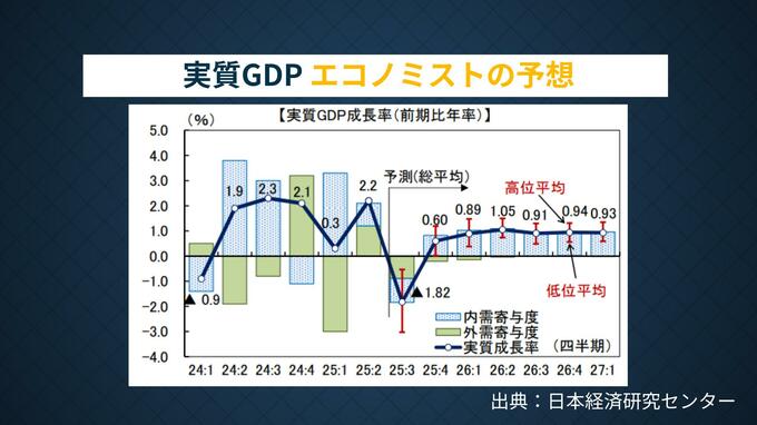 今回のGDPから、先々の日本経済を見るカギはあるのでしょうか?日本経済研究センターによるエコノミストの予想では、10-12月期はプラス成長に戻ると見込まれているものの、その勢いは弱いとみられています。