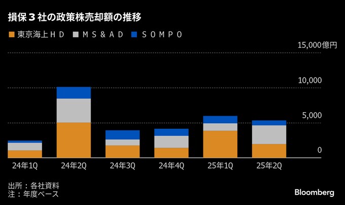 (ブルームバーグ):国内損害保険大手3社は今期(2026年3月期)の政策保有株式の売却計画をそれぞれ引き上げた。3社合計では期初計画から約1350億円上振れした1兆5000億円を見込む。