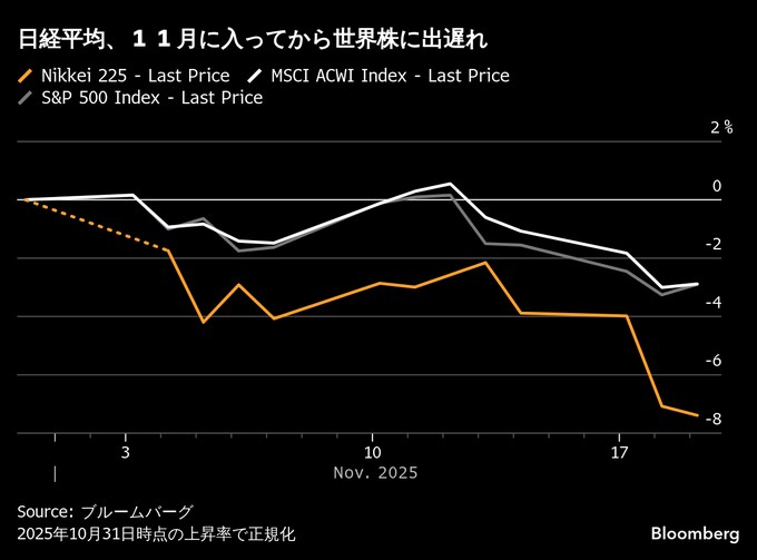 日本市場で今週見られた資産横断的な売りは、いわゆる「高市トレード」の脆(もろ)さを浮き彫りにした。積極的な財政・経済政策が経済成長を押し上げるとの期待で日経平均は10月末にかけ史上最高値を更新したが、高市政権発足からわずか1カ月足らずで首相選出以降の上げを全て失い、投資家に厳しい現実を突きつけた。