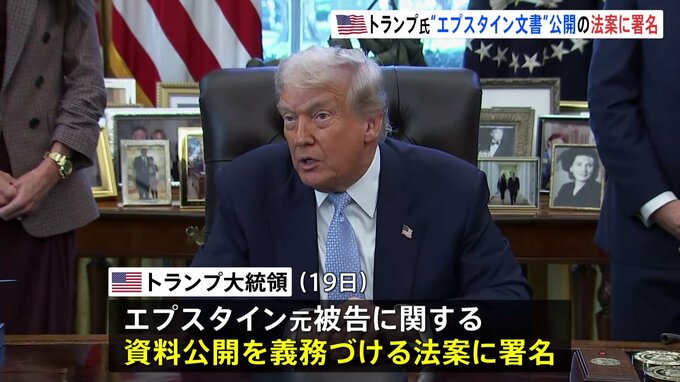 アメリカのトランプ大統領は、性的虐待の罪に問われたエプスタイン元被告に関連する資料の公開を義務づける法案に署名しました。資料は30日以内に公開されます。トランプ大統領は19日、議会で承認されていたエプス…