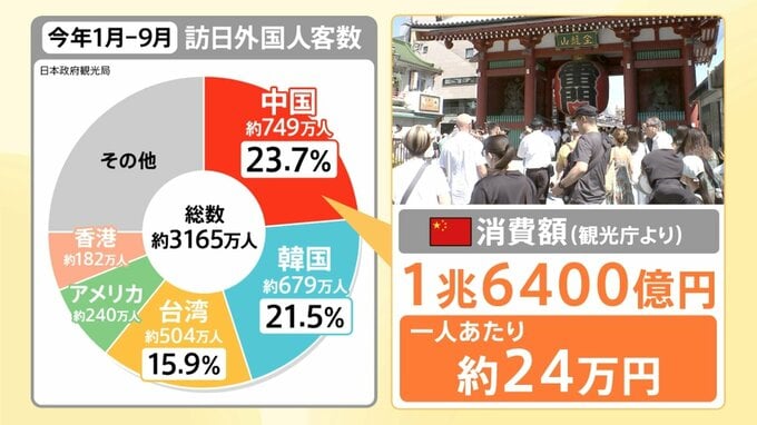 観光庁によると、中国人観光客の皆さんが日本で使っている金額は一人あたり約24万円だといいます。全体で1兆6400億円使っているということで、これは大きな金額ですよね。
