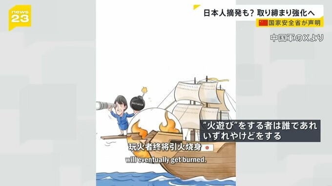 台湾有事に関する総理答弁をめぐり、中国の反発は日を追うごとにエスカレートしています。中国軍がいま、高市総理とみられる人物を題材にした“風刺画”をSNS上に相次ぎ投稿。スパイの摘発を担う国家安全省も、日本人の摘発をちらつかせ、取締りを強化すると発表しました。日中関係の溝が深まる中、総理答弁の撤回は行われるのでしょうか?