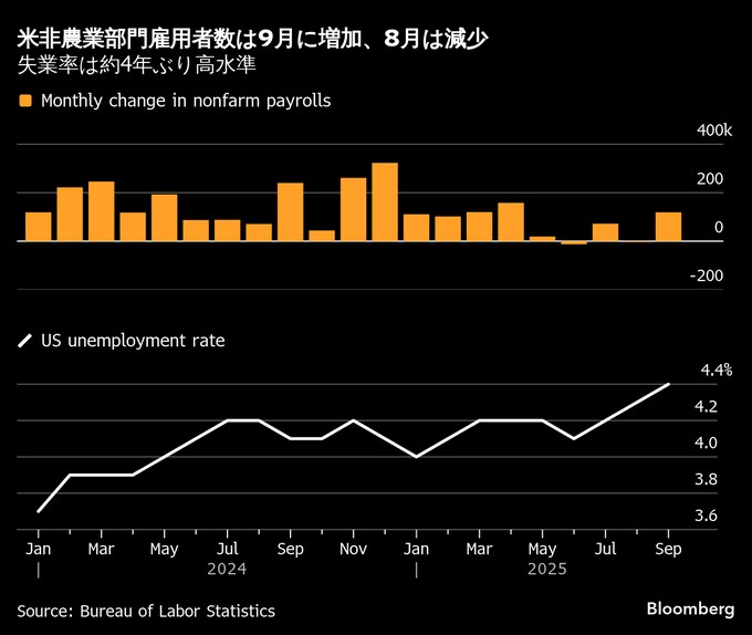 (ブルームバーグ):9月の米雇用統計では、非農業部門雇用者数が市場予想を上回る伸びとなった。ただ、8月分は減少へと下方修正された。失業率も前月に比べて上昇し、さまざまな要因が交錯する不安定な労働市場の姿が浮き彫りとなった。