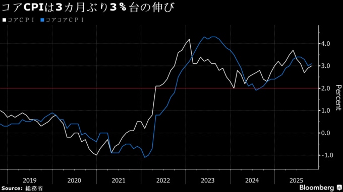 (ブルームバーグ):10月の全国消費者物価指数(生鮮食品を除くコアCPI)は、前年比上昇率が2カ月連続で拡大し、3カ月ぶりに3%台に乗せた。日本銀行が進める金融政策正常化の支えとなりそうだ。