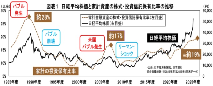 日本家計金融資産に占める株式・投資信託の割合は、1980年代後半のバブル時に約28%まで上昇しており、新NISAで投資が増えた直近2025年6月末の約19%と比べても、当時の投資の多さがわかる。