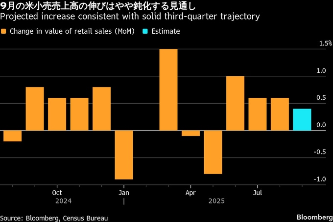 ブルームバーグがまとめたエコノミスト調査の中央値によると、9月の小売売上高は、前月比0.4%増と予想されている。前月は0.6%増だった。