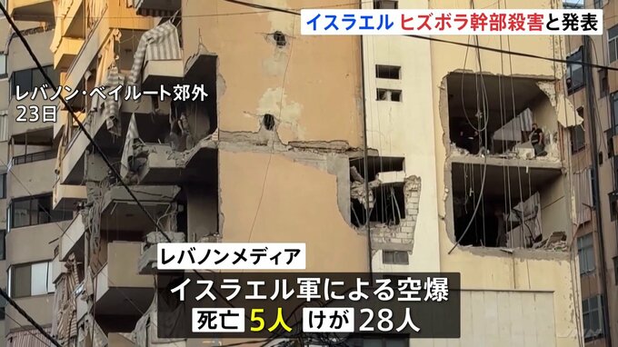 中東レバノンの首都でイスラエル軍による空爆があり、5人が死亡しました。イスラエルは、イスラム教シーア派組織ヒズボラの軍事部門トップを殺害したと発表しています。レバノンメディアによりますと、23日、首都…