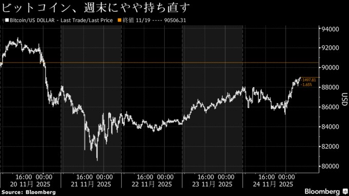 ビットコインは、21日に一時7カ月ぶりの安値となる8万554ドルまで下落した後、週末に回復基調に入った。過去4週間で20%強下落した後、24日は1%未満の上昇にとどまり、8万8400ドル付近で推移した。