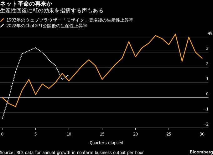 金融市場のアナリストは、AIが経済の生産性を高めている兆候を探ろうと、あらゆるデータを精査している。この種の持続的な成長押し上げが最後に見られたのは1990年代のインターネット革命だった。当時、米連邦準備制度理事会(FRB)のグリーンスパン議長は、技術革新によってインフレを招かずに高成長が可能になると判断し、その見立てをもとに金融緩和的な姿勢を維持した。