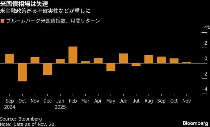 今週は感謝祭の祝日の関係で、取引時間が通常より短い。ブルームバーグ米国債指数は11月はわずかな伸びにとどまる見通し。同指数は過去10カ月のうち8カ月で上昇した。