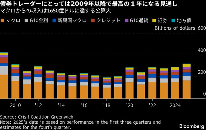 クリシル・コーリション・グリニッチのデータによると、ゴールドマン・サックス・グループやJPモルガン・チェース、シティグループといった企業が債券・クレジット・商品トレーディングから得る収入は今年1650億ドル(約25兆7400億円)に拡大する見通し。2024年比で10%増となる。