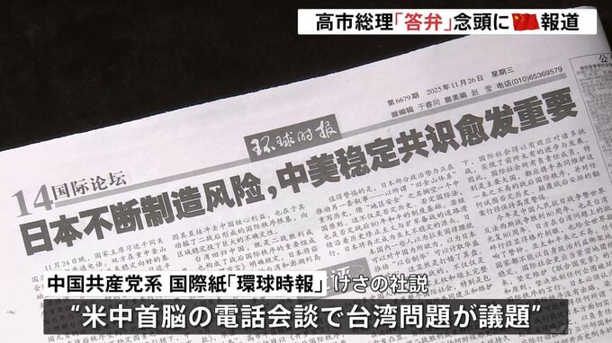 中国共産党系の国際紙「環球時報」は、けさの社説で、米中首脳の電話会談で台湾問題が議題になったことを紹介。高市総理の台湾有事をめぐる答弁を念頭に「戦後秩序が一部の国から挑戦を受けるなか、原則的な問題に…