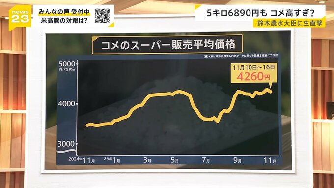 「新米が流通すれば下がる」という期待もあった中で、11月10日の週の平均価格は5キロで4260円でした。過去最高値だった前の週よりやや下がりましたが、依然高止まりを続けています。