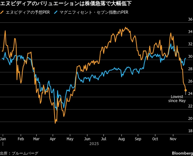 株価の下落に伴い、向こう12カ月の利益見通しに基づくエヌビディアの株価収益率(PER)は26倍未満と、今月初めの約34倍から大きく低下している。