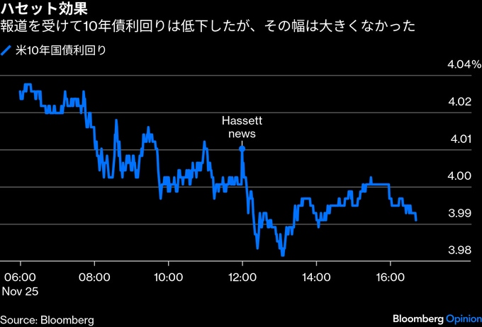 現時点で重要なのは、ハセット議長誕生の可能性に市場が過度な反応を示していないことだ。これが市場による最初の試験だったとすれば、ハセット氏はクリアできたことを意味する。最終的に指名される可能性を高めることにもつながるだろう。