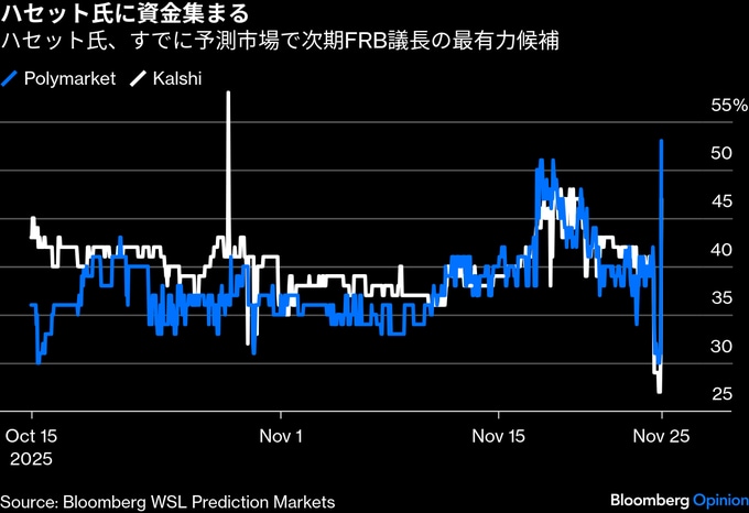 記事は一読の価値があるし、予測市場もハセット氏最有力の報道を真剣に受け止めている。ただ、ハセット氏の指名が確実だとまではみられておらず、コラム執筆時点での確率はポリマーケットで57%、カルシで56%となっている。