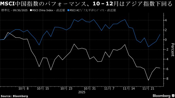 中国株は約1カ月前に付けた数年ぶり高値からの下落局面にある。MSCI中国指数は10-12月(第4四半期)に6.2%下げている一方、MSCIアジア太平洋指数は1.3%上昇している。