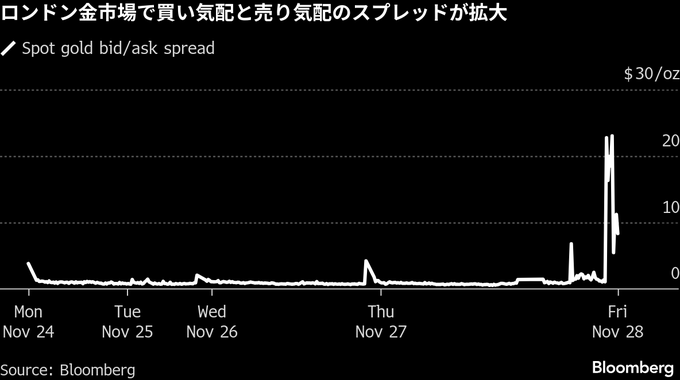 サクソ銀行のストラテジスト、オーレ・ハンセン氏は「貴金属トレーダーは先物を利用して現物市場の取引を相殺またはヘッジするため、現物市場と先物市場は密接に関連している。そのルートが機能停止すると、スプレッド拡大と取引減少を通じ、現物市場も打撃を受ける」と指摘した。米国では感謝祭の連休で元々閑散となる日だったことも、状況を悪化させたという。