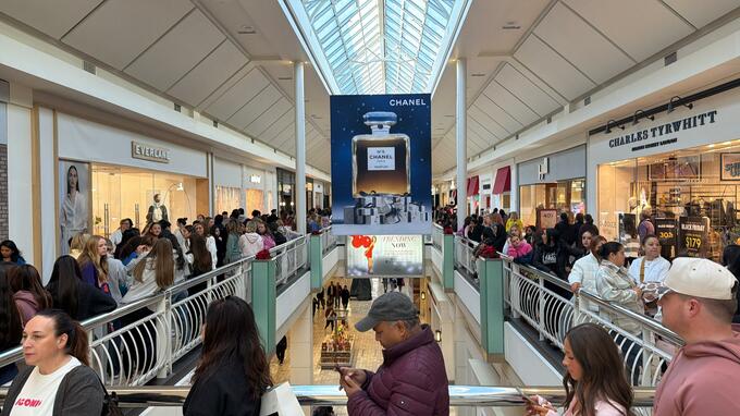目玉セールを展開する店舗への集客も目立った。バージニア州ニューポートニューズのバスアンドボディワークス店舗では「3点買うと4点無料」を掲げて大混雑。来店客は横向きにならないと前に進めないほどだった。