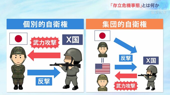 日本が直接、武力による侵略を受けた場合、自国を守るのが「個別的自衛権」。政府はそれまで、憲法9条のもと、個別的自衛権しか行使できないとしてきた。