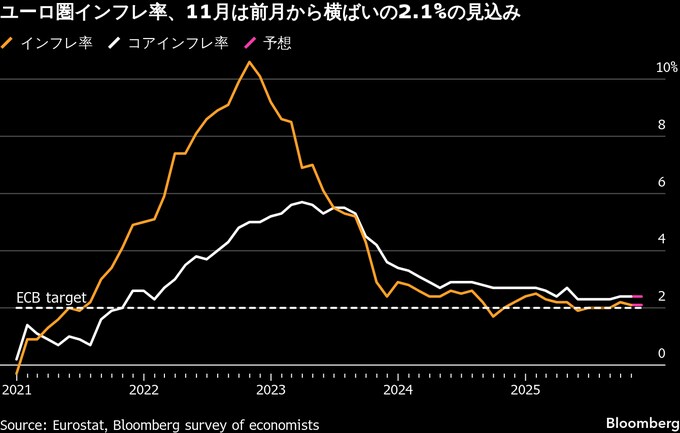 (ブルームバーグ):12月2日に発表されるユーロ圏の11月インフレ率は2%近辺にとどまる見通しだ。12月の会合で金利を調整する必要はないとの安心感を欧州中央銀行(ECB)に与えそうだ。