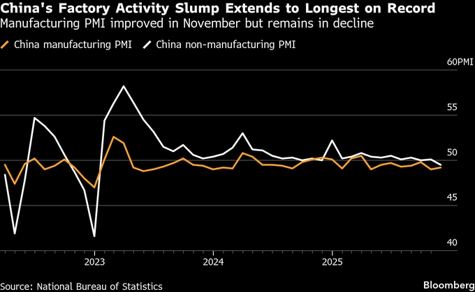 (ブルームバーグ):中国の製造業活動は11月に改善したものの、依然として縮小圏にとどまり、長期低迷の記録を更新した。景気減速が深まっている。