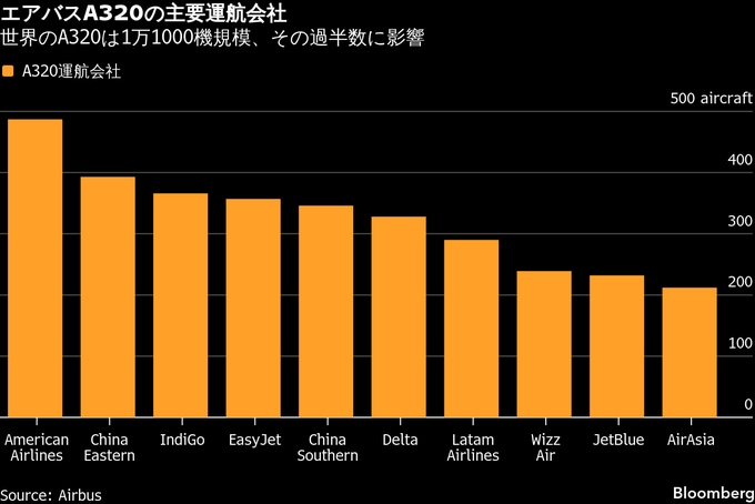 エアバスによると、今回の不具合で影響を受けた機体は6000機超に上り、世界のA320の過半数を占める。特定の条件下で、飛行制御維持に必要なコンピューターデータが破損するリスクがあるという。