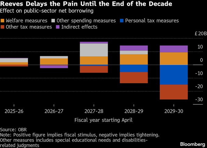 リーブス氏が11月26日に発表した秋季予算案は、増税と歳出抑制の大半を後半に集中させることで収支を合わせている。世帯と企業に対する増税は2028-29年度から本格化し、翌年度には260億ポンド(約5兆3600億円)に達する。一方、次の総選挙は遅くとも29年8月までに実施される必要がある。