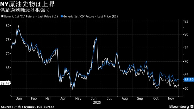 ニューヨーク商業取引所(NYMEX)のWTI先物1月限は、前営業日比77セント(1.3%)高の1バレル=59.32ドルで終了。ロンドンICEの北海ブレント2月限は1.3%高の63.17ドル。
