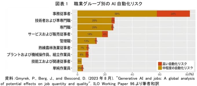 ILOの分析によると、生成AIは人間の仕事を奪うというより、仕事の質を変える可能性が高いが、職種によってそのリスクは両極端である。