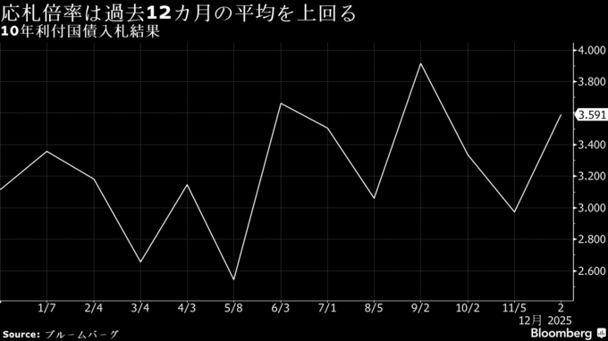 (ブルームバーグ):財務省が2日に実施した新発10年国債の入札は、投資家需要の強弱を反映する応札倍率が過去12カ月平均(3.2倍)を上回った。利回り水準の高さを評価した投資家の需要が集まり順調にこなした。