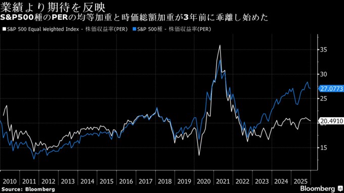 次のチャートは、S&P500種の時価総額加重指数(マグニフィセント・セブンが今や3分の1余りを占める)と、全銘柄を0.2%ずつ割り当てた均等加重指数の株価収益率(PER)を比較したものだ。