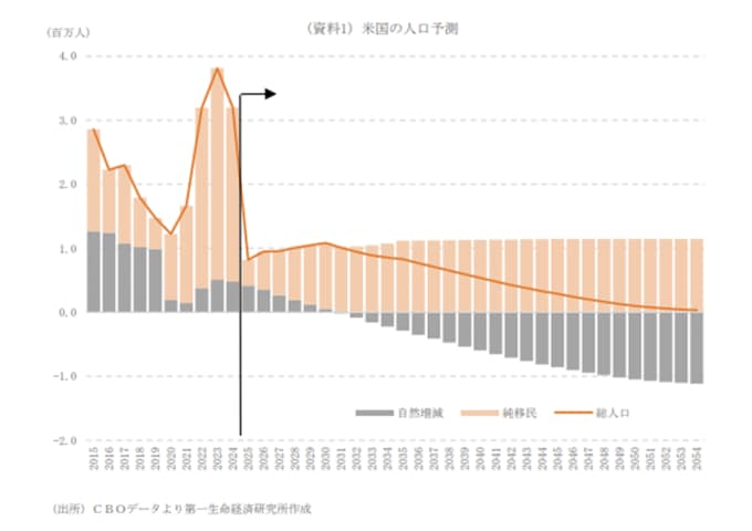 これらの政策を受け、CBO(議会予算局)による最新の人口予測(25年9月)は下方修正された。ただ、抜本的な移民制度の変更は不可能との見方から、移民の増加が続き、米国の人口増加を支え続けると予想されている。