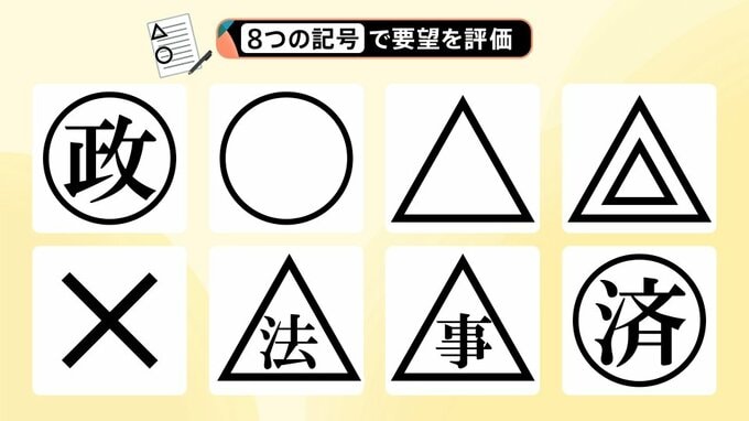税制改正の大綱を作るための議論の中で、各省庁からの要望をどう決めていくのでしょうか。まず、「やるか」「やらないか」を8つの記号で評価していくということです。
